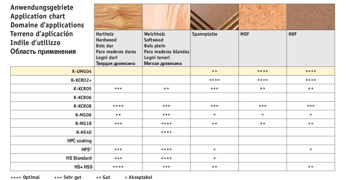 Aufgrund der Materialstruktur ist MG18 das Optimum für 45° Schneidwinkel. Es ermöglicht dabei eine harte, scharfe und verschleissfeste Schneidkante. Diese HM-Sorte ist ideal zur Bearbeitung von Massivholz bei gleichzeitig höherem Standweg.
