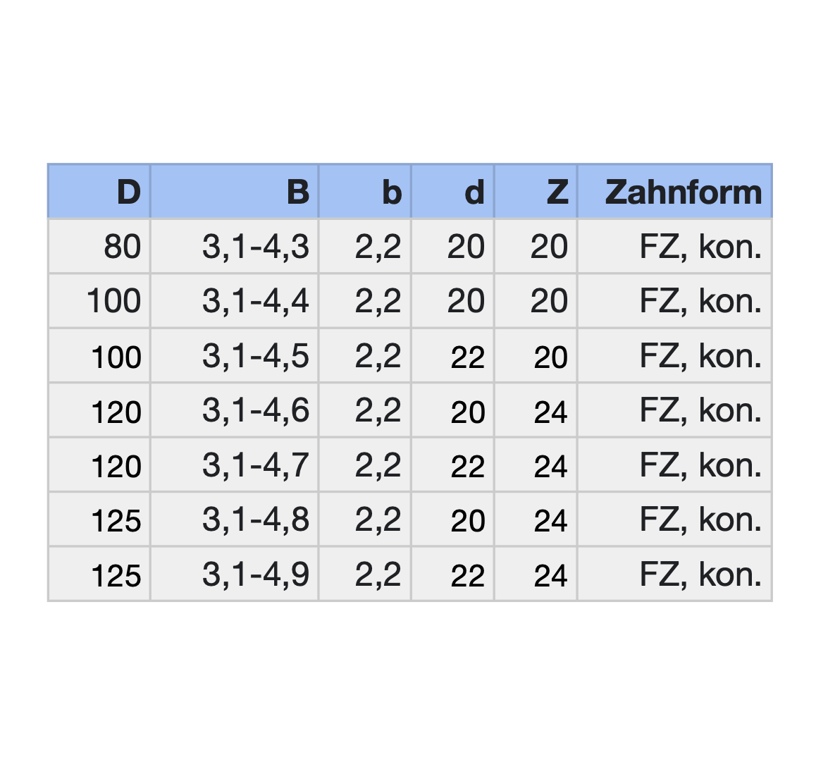 • Zahnform: FZK (Flachzahn konisch)